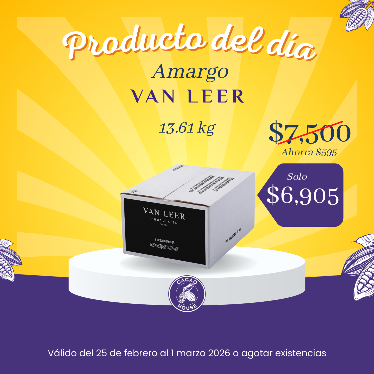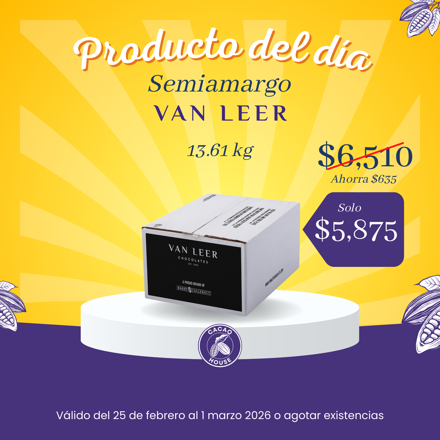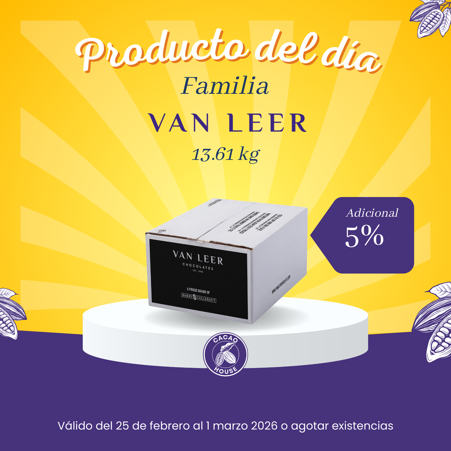 Todos los sabores de chocolate Van Leer en su presentación de 13.6 kg tienen un 5% adicional. Lleva el tuyo antes que te lo ganen.