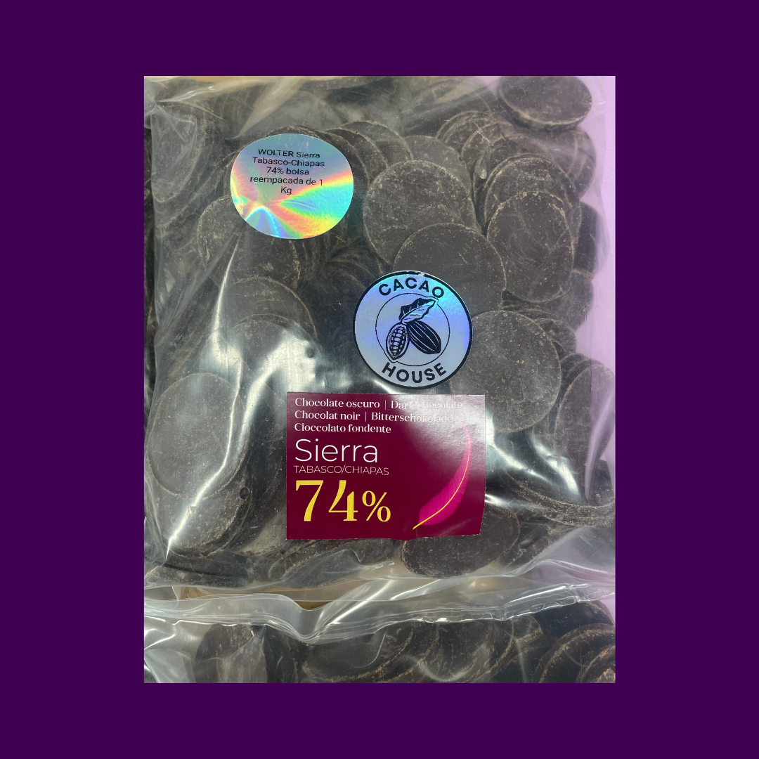 Este delicioso chocolate amargo 74% Sierra Tabasco hecho con cacao mexicano en presentación de gota, con notas de sabor a ciruela y tabaco con agradable acidez. Elaborado con una mezcla de variedad de cacaos trinitarios de la Sierra ubicada entre Tabasco y Chiapas, manteca de cacao, azúcar de caña y lecitina de girasol.