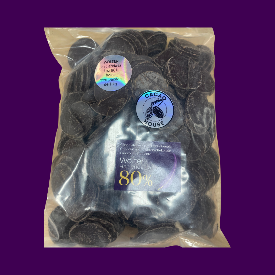 Este delicioso chocolate amargo 80% hacienda de la luz hecho con cacao mexicano en presentación de gota, con notas amaderadas nuez de castilla y aceituna negra. Este chocolate mexicano elaborado con una mezcla de cacaos de nuestra propia plantación en Comalcalco, Tabasco con manteca de cacao, azúcar de caña y lecitina de girasol.